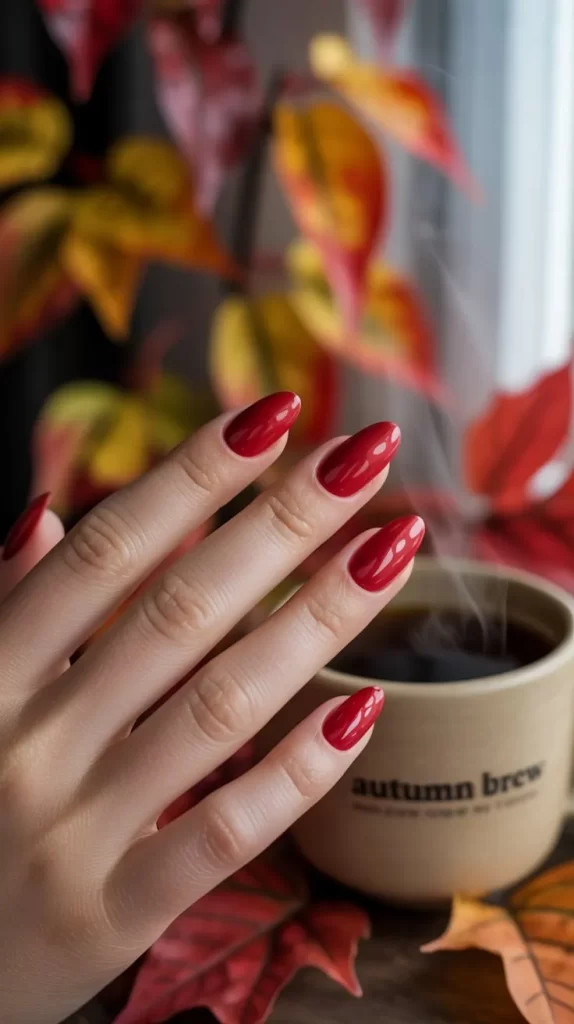 Classic glossy red nails never go out of style. This timeless design looks stunning on any nail length, whether you prefer short, almond, or square shapes. A shiny topcoat brings out the richness of the red, making your nails pop in the crisp fall air. These nails are perfect for both casual and formal settings.