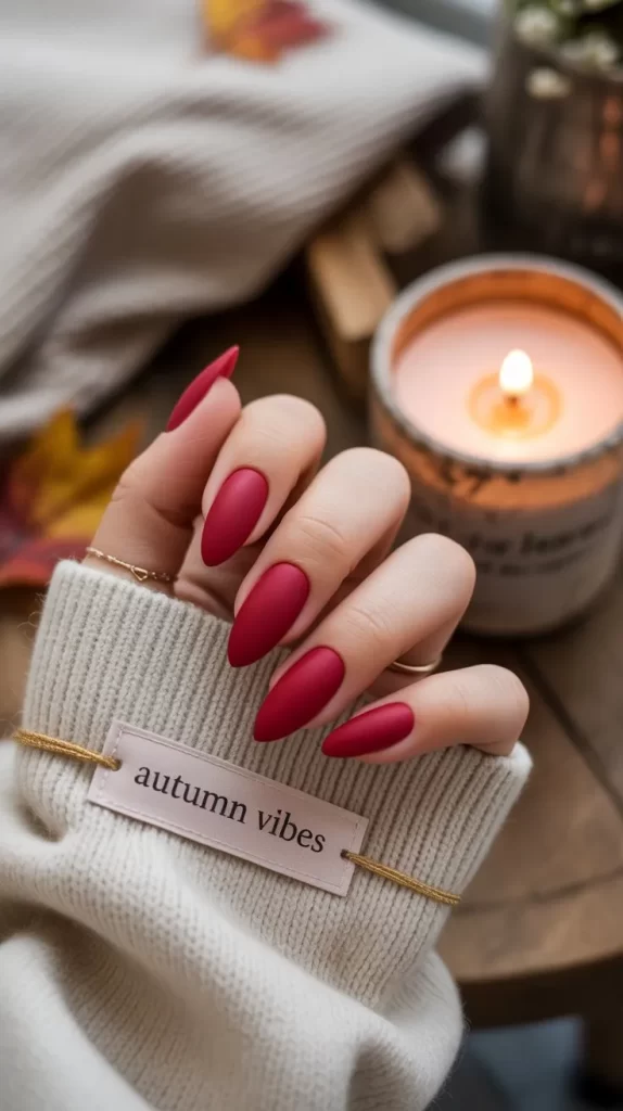 Matte red nails are bold and modern. The matte finish adds a sophisticated touch, giving a fresh twist to traditional glossy polish. This design is perfect for fall, as the muted look pairs beautifully with cozy outfits and seasonal colors.