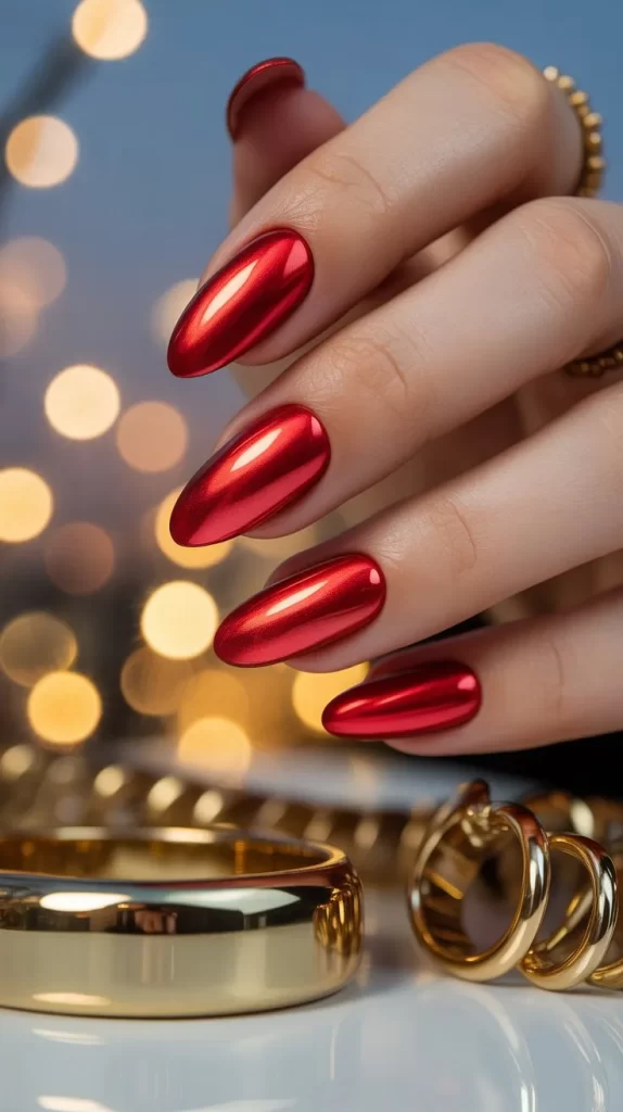 Red chrome nails have a mirror-like metallic finish that shines beautifully in fall light. They look modern, bold, and trendy, making them stand out.