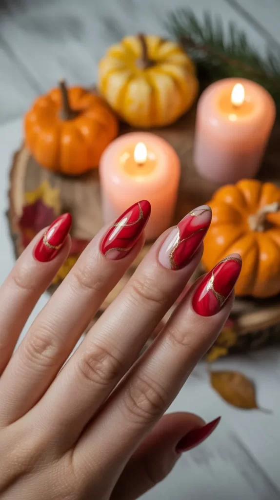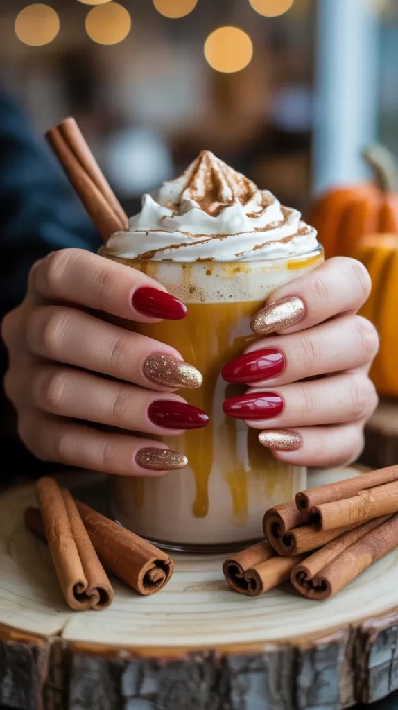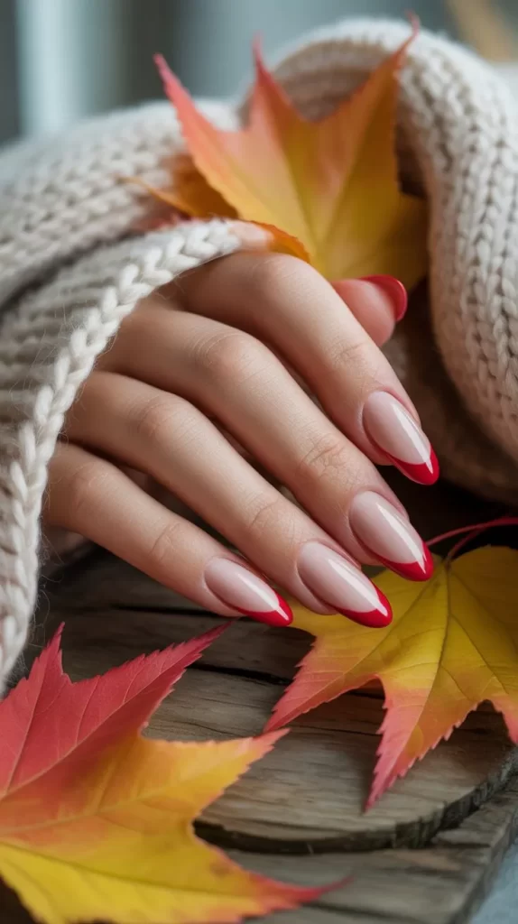 If you want something festive for fall parties, red nails with gold glitter tips are a perfect choice. The red base adds depth, while the glitter tips bring sparkle. It’s an easy design that feels both playful and glamorous.
