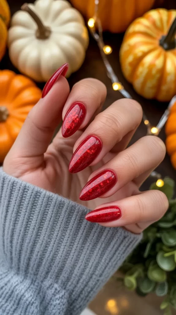 This design is festive yet classy, making it ideal for anyone who loves shine. Red glitter nails add excitement to any fall outfit.