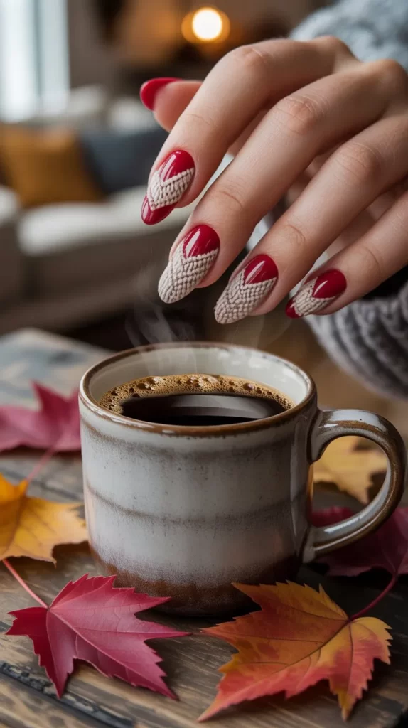 Sweater nails feature cozy knit-like patterns made with textured polish. On a red base, this design is warm, stylish, and perfect for fall. It gives your nails a 3D effect that looks unique.