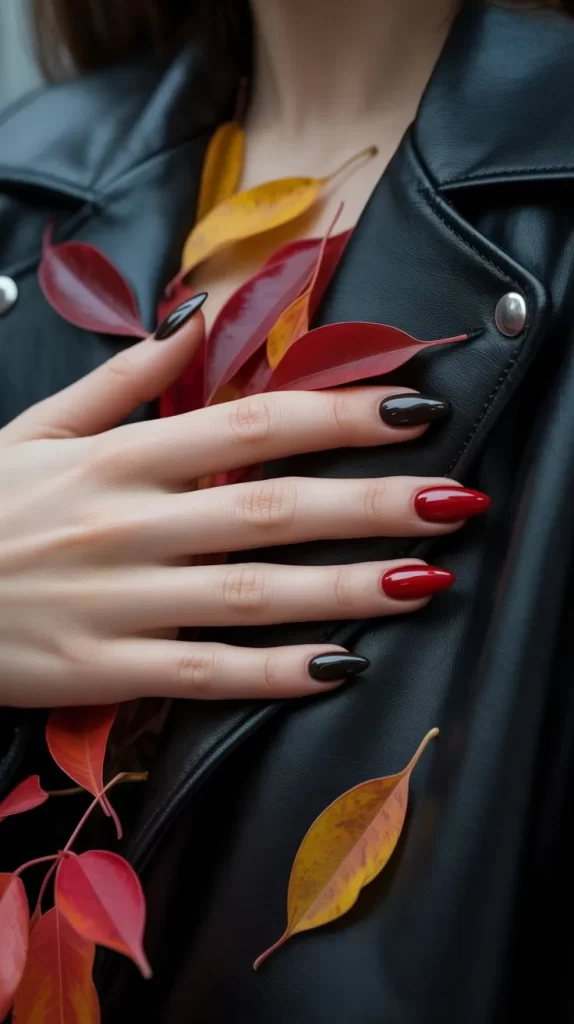 Red and black nails create a bold, edgy vibe. You can alternate colors on each nail or combine them in unique patterns. Black adds depth while red keeps the look vibrant and chic.