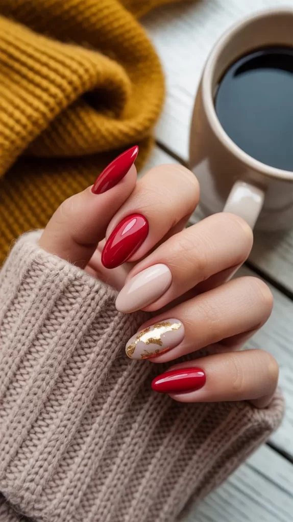 If you love a minimalist look, try combining red nails with nude accent nails. The nude base softens the boldness of the red, making it chic and elegant. You can add small designs like dots, stripes, or gold foil.
