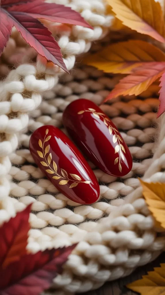 Fall leaves are one of the most iconic seasonal designs. Red nails with tiny gold or black leaf patterns add a seasonal touch. You can add leaves on just one accent nail or across all.