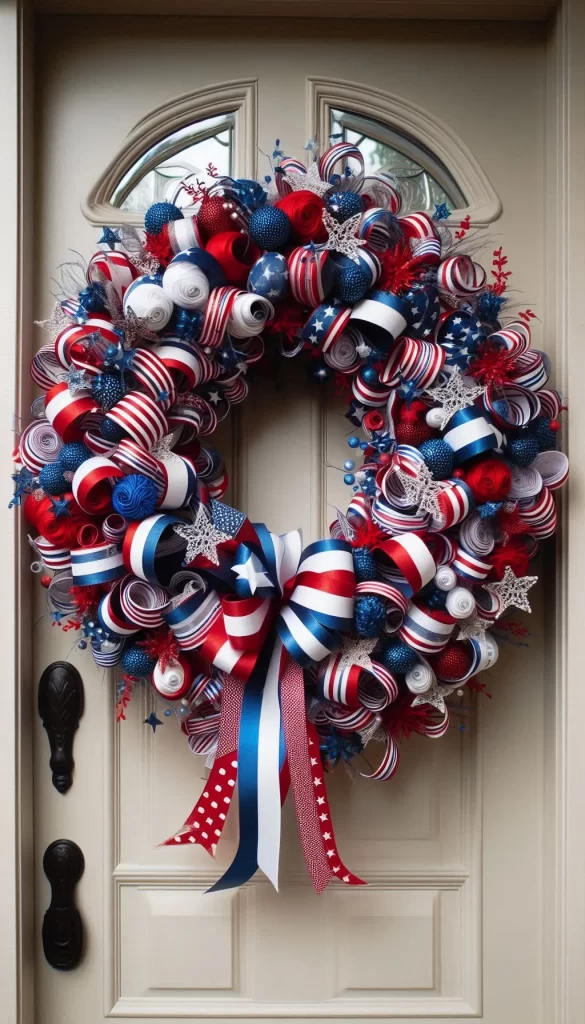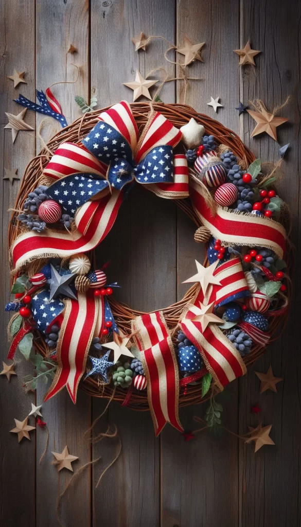 A timeless wreath featuring flag-themed ribbon and stars for a proudly patriotic vibe. Buy on Amazon