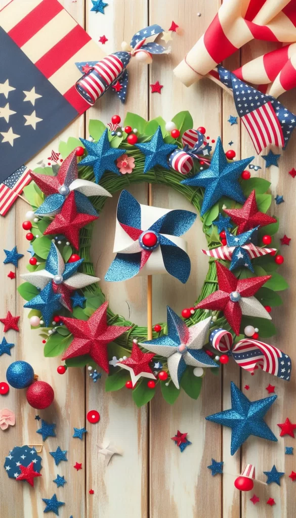 Whimsical pinwheels spin into a joyful patriotic wreath for any door.