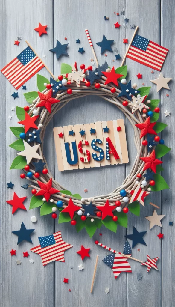 A playful wreath made of painted popsicle sticks mimicking fireworks and flags.