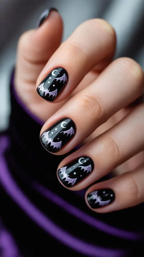 Bats flying in the night are iconic for Halloween. Paint your nails dark, like black or midnight blue, and draw small bat wing silhouettes flying across each nail. Add tiny white stars or moon details for extra charm.