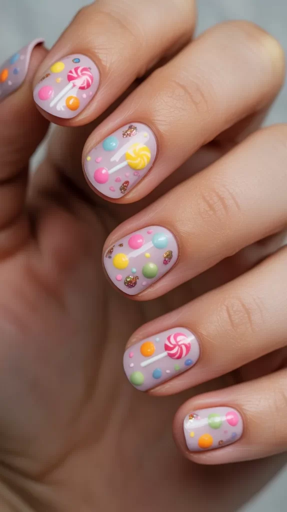 Celebrate the sweet side of Halloween with candy nails. Paint short nails in pastel or bright colors and draw candy shapes, lollipops, and Halloween treats. Add tiny glitter accents for a sugary sparkle.