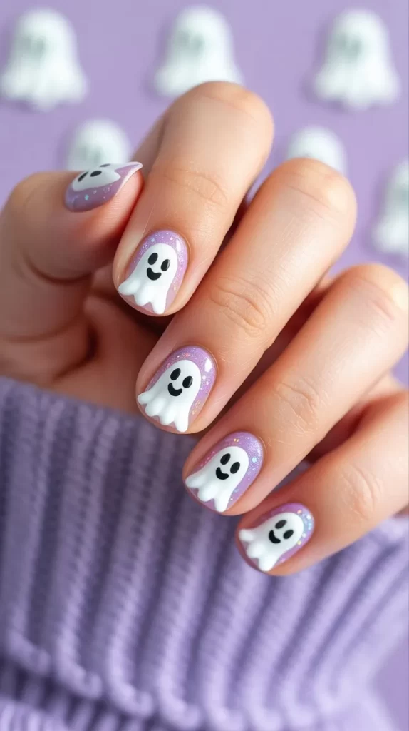 Short nails can carry adorable ghost designs beautifully. Use a soft white base and paint small ghost shapes with black eyes and mouths. You can make each ghost slightly different to add personality. A pastel or muted background color like lavender or gray can make the ghosts pop and look extra cute.