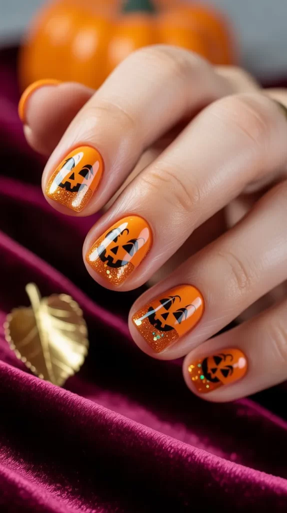 Take pumpkin nails up a notch by adding glitter. Paint short nails in orange, then layer with golden or orange glitter polish. You can still add small pumpkin faces or vines for extra charm. Glitter adds sparkle and makes the design festive.