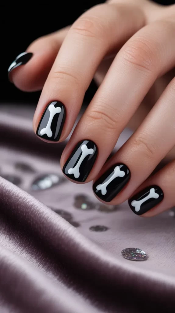 Go classic with skeleton nail art. Paint nails in black and draw tiny white bones or skulls on each nail. You can make each nail different for variety or keep a uniform skeleton theme. Short nails make the bones look cute and proportional.