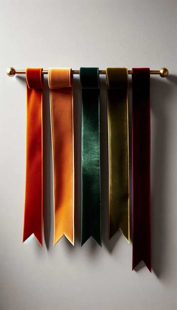 Introduce rich, luxurious textures without taking up space using velvet ribbons in fall tones for a vertical hanging display.