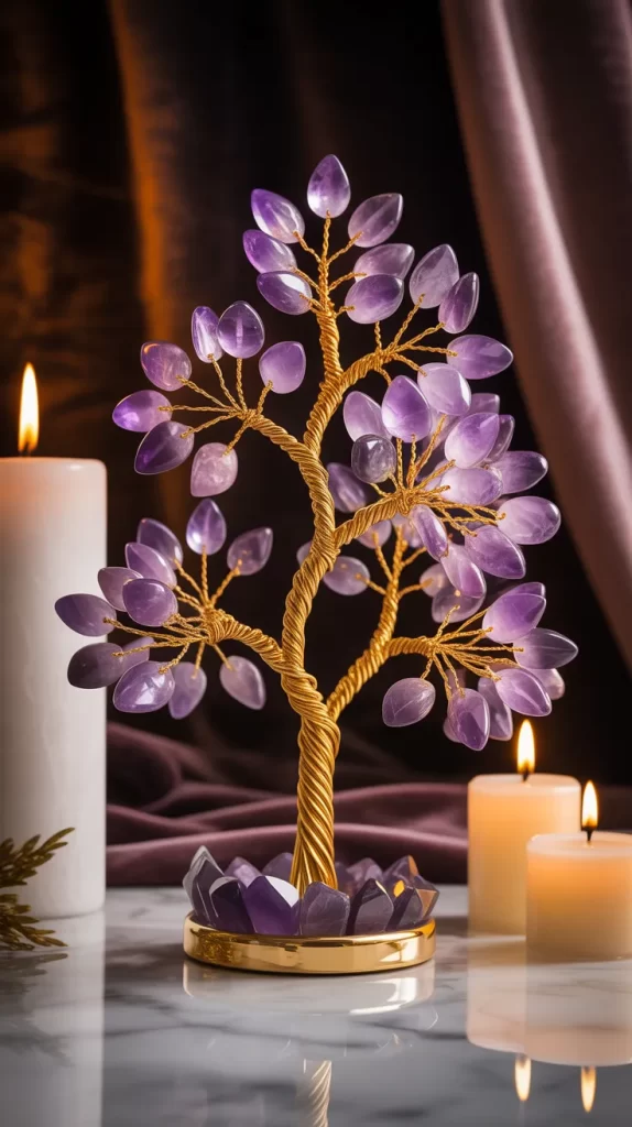 For a royal touch, try an amethyst crystal tree. Its deep purple tones bring richness and positive energy to your room. The gemstone chips can be wired onto gold or black metal stems for contrast.