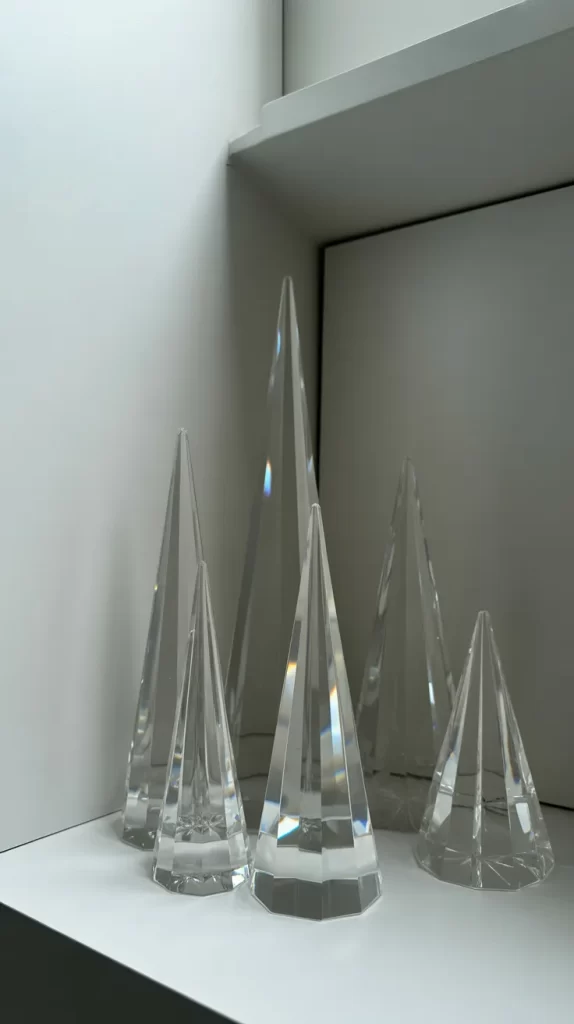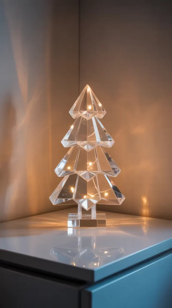 This modern design uses stacked crystal or glass cones of decreasing size to mimic a tree silhouette. It’s sleek and minimalistic yet eye-catching.