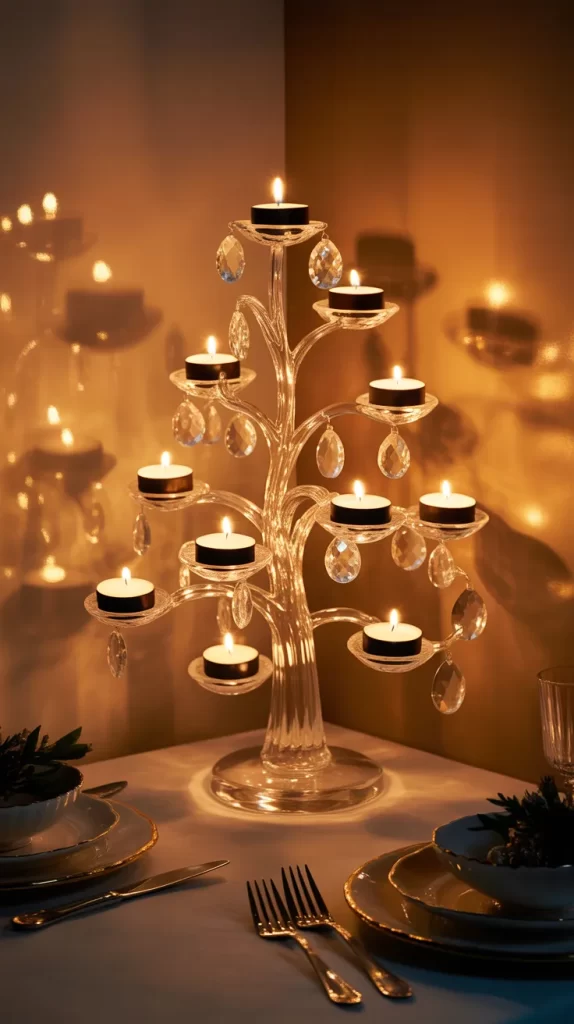 This multipurpose idea combines function and beauty. A small crystal tree doubles as a candle holder—each tier holds a tea light or LED candle.