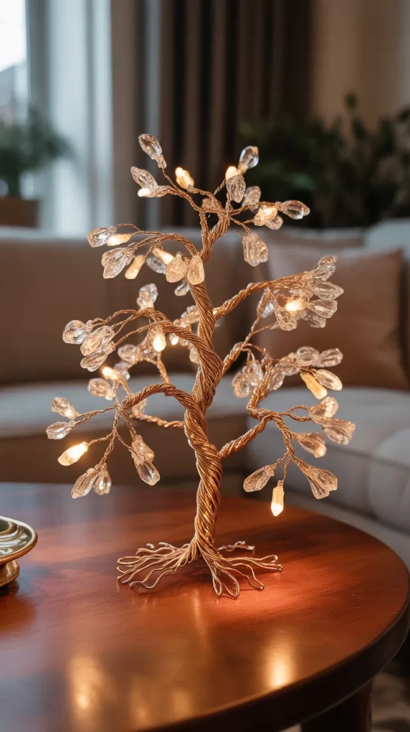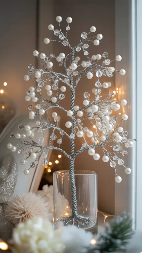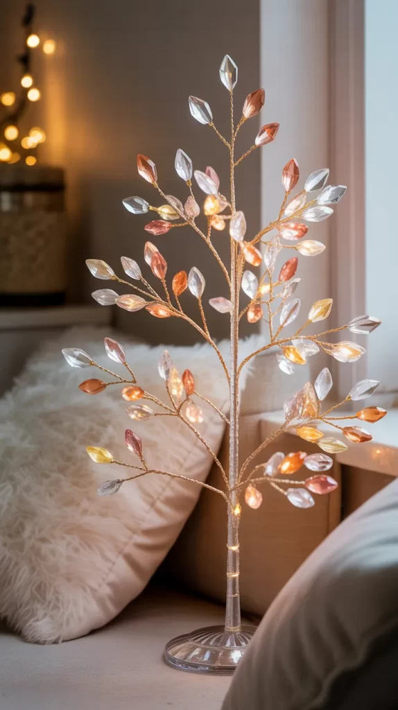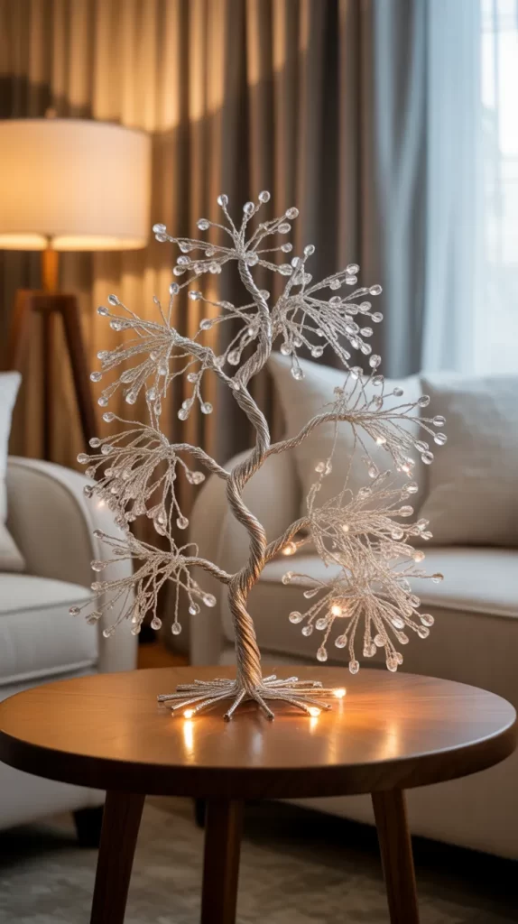 This simple yet luxurious idea uses wire branches covered in small crystal beads. Arrange them into a tree shape, and each bead catches the light, creating a sparkling display. You can use silver, gold, or clear beads for a glamorous effect. The tree fits perfectly on a tabletop or dresser, making it ideal for smaller rooms.