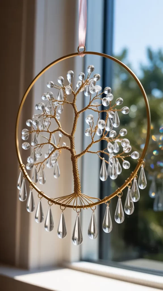 You can use clear or colored crystals for a custom look. This small hanging tree adds graceful motion and shimmer, perfect for windowsills or tabletops. It feels light, modern, and full of charm.