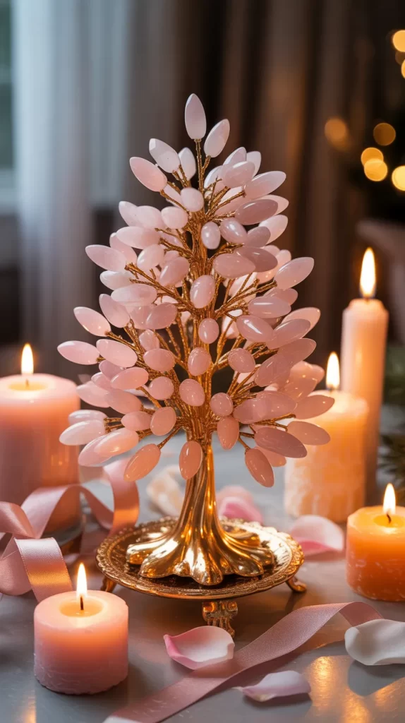 Bring love and calm to your holidays with a small rose quartz crystal tree. Each pink stone adds a warm, romantic hue to your décor. You can create one using a small metal wire base and polished rose quartz chips.