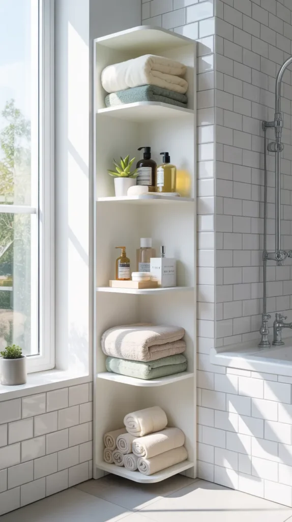 A vertical corner shelf tower in the bathroom is perfect for towels, toiletries, and skincare products. Stack three to five shelves upward to maximize storage in tight spaces.