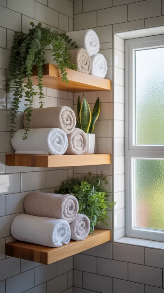 Combine rolled towels and small plants on corner shelves for a spa-like look in tight bathrooms.