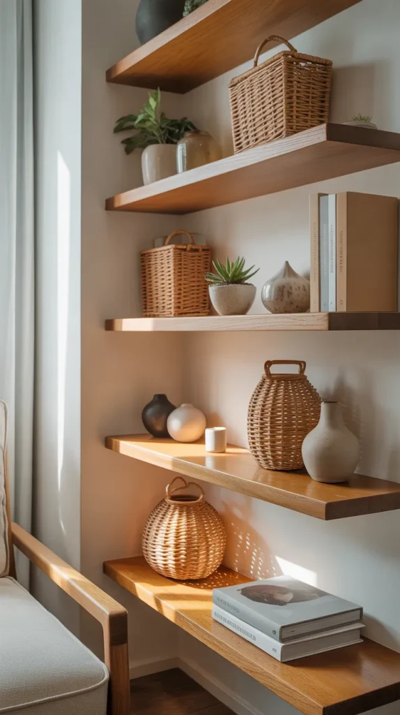 Floating wood corner shelves are a classic smart storage choice for small homes. They provide just enough surface space for books, framed photos, and small plants without crowding the room. Installing two or three shelves vertically makes use of wall height, which is perfect when floor space is limited.