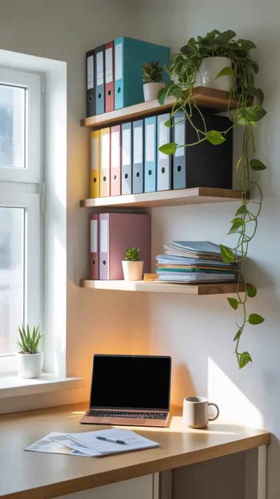 In compact workspaces, corner shelves above a desk provide storage for files, notebooks, and office supplies. This keeps your desk clear while still having essentials nearby.
