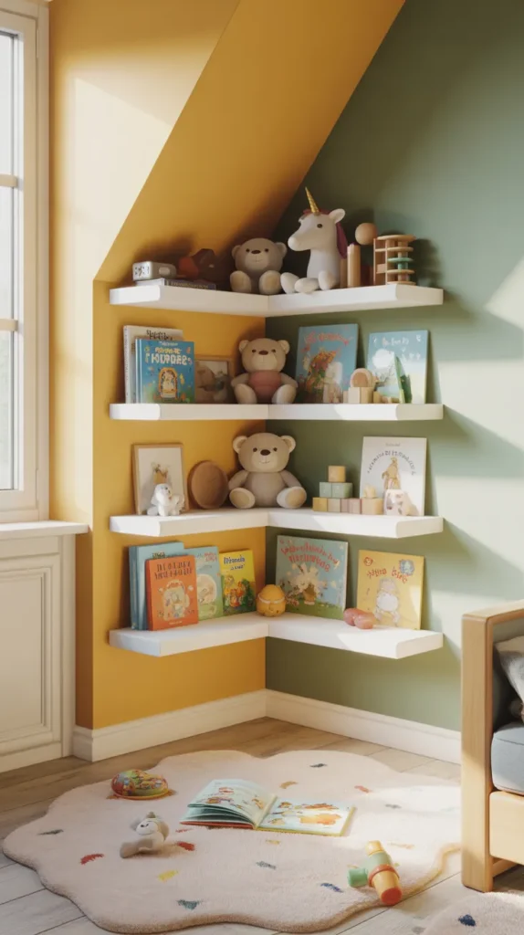 In children’s rooms, corner shelves are perfect for books, toys, and crafts. Place lower shelves for easy access and higher shelves for display items.