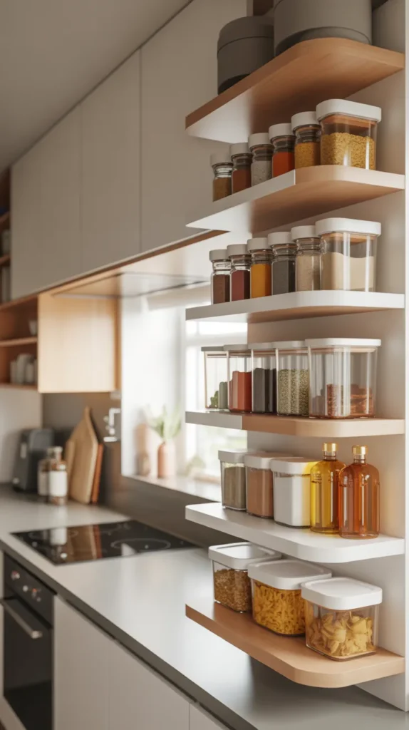 In small kitchens, corner shelves can become a compact spice rack or pantry zone. Use slim floating shelves to hold jars, oils, and cooking essentials. This keeps countertops clear while putting everyday items within easy reach.