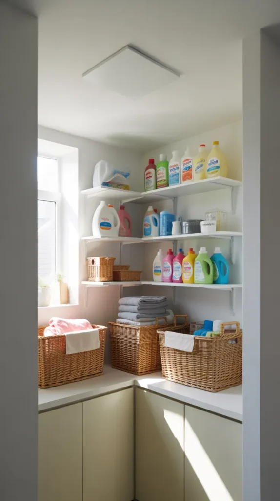 Even tiny laundry areas benefit from corner shelving. Store detergents, baskets, and cleaning tools neatly off the floor.