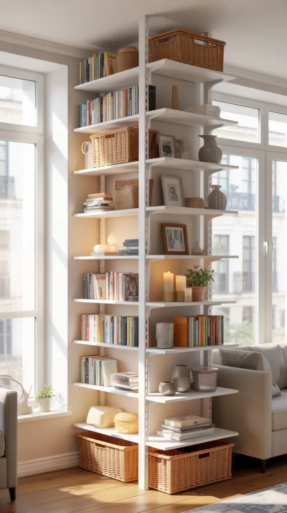 Finish with a full-height corner shelf tower using four or more shelves stacked vertically. Use it for books, baskets, decor, and daily essentials.