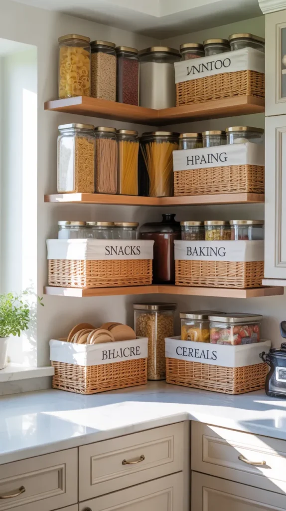 Use a corner shelf stack for pantry overflow like snacks, canned goods, or beverages. Label baskets for quick access.