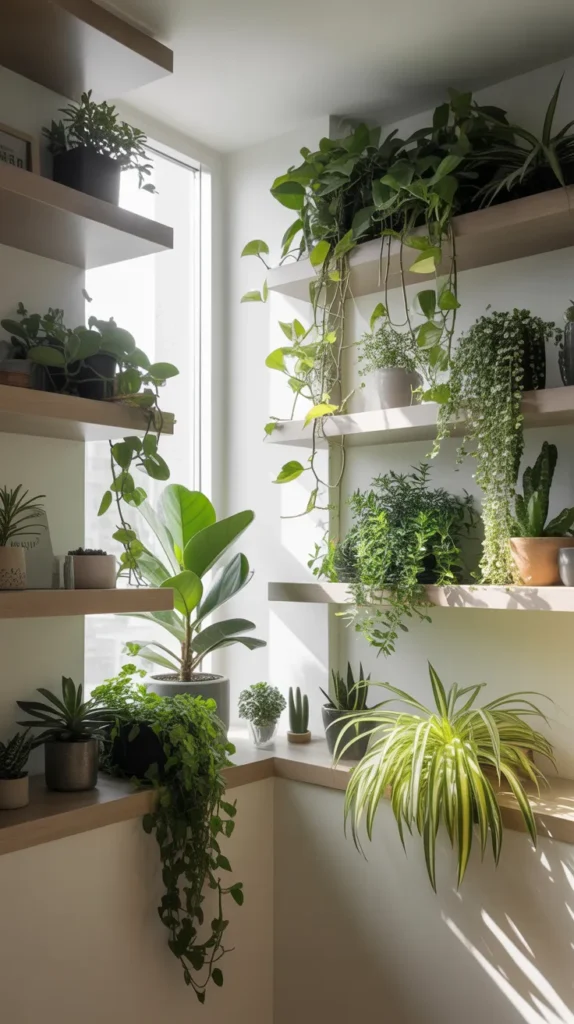 Create a vertical plant corner using staggered shelves. Add trailing plants, small pots, and decorative planters for a fresh look.
