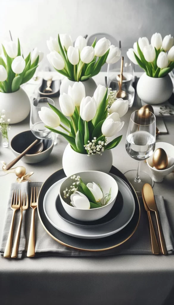 - Add a centerpiece of white tulips or ranunculus in a geometric vase.