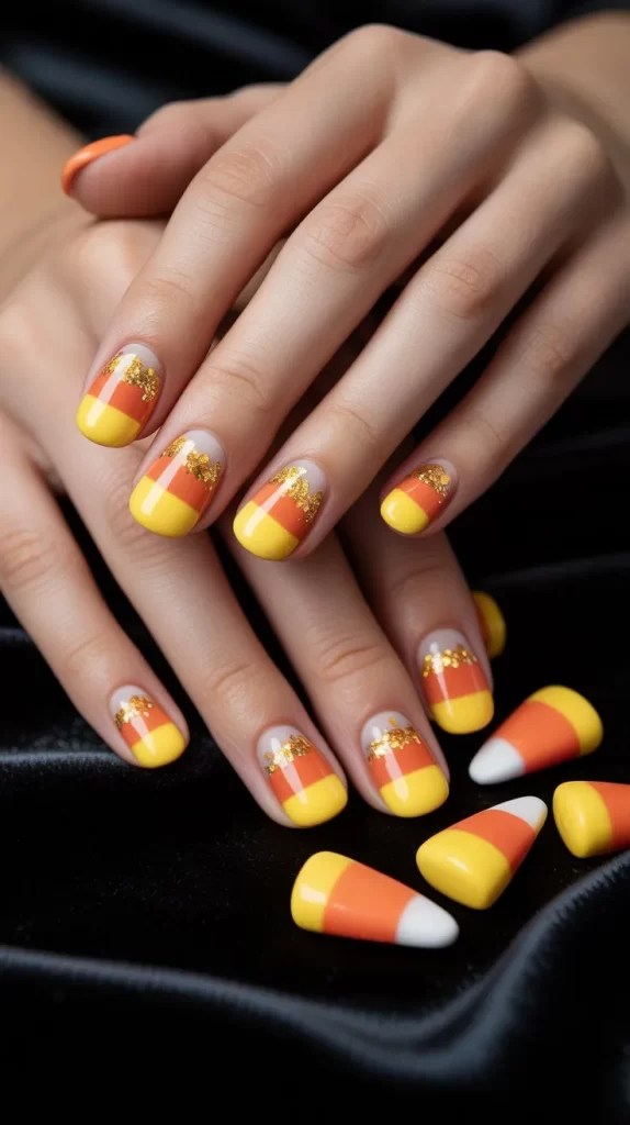 Candy corn nails get a sparkling 2025 upgrade with glitter accents. The bright yellow, orange, and white stripes add playful sweetness, making them perfect for family-friendly USA Halloween gatherings.
