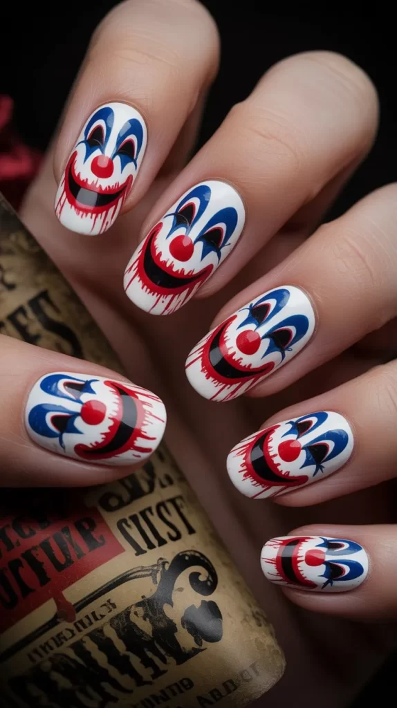 Inspired by horror clowns, this 2025 trend mixes bright colors with blood drips and creepy smiles. Perfect for daring Halloween partygoers across the USA who want bold nail art.