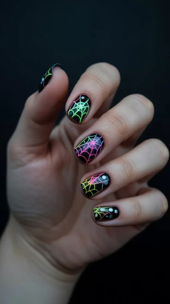 2025 introduces futuristic spider webs with neon and metallic finishes. This bold design pairs perfectly with cyberpunk-inspired Halloween outfits and is popular in urban USA Halloween events and techno-themed parties.