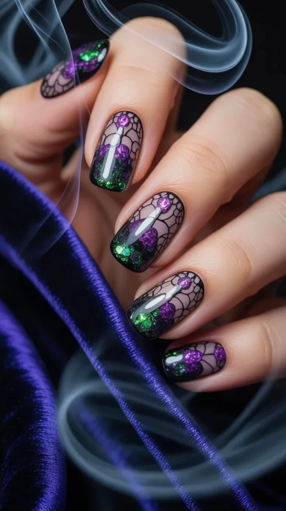 Dark fairy nails bring gothic elegance with shimmering greens, purples, and black lace effects. In 2025, this whimsical yet spooky look is rising in popularity across USA Halloween festivals.