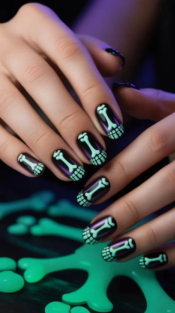 Skeleton nails are a Halloween classic, and 2025 adds glow-in-the-dark details. The glowing bones create a spooky yet fun vibe, perfect for parties, concerts, or trick-or-treating nights in the USA.