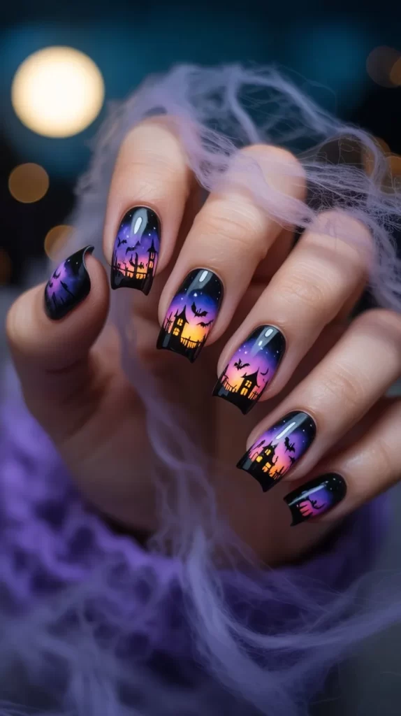 Haunted house skyline nails are intricate and dramatic. Featuring spooky houses, bats, and moonlit skies, this 2025 design is perfect for nail art lovers at USA Halloween parties and events.