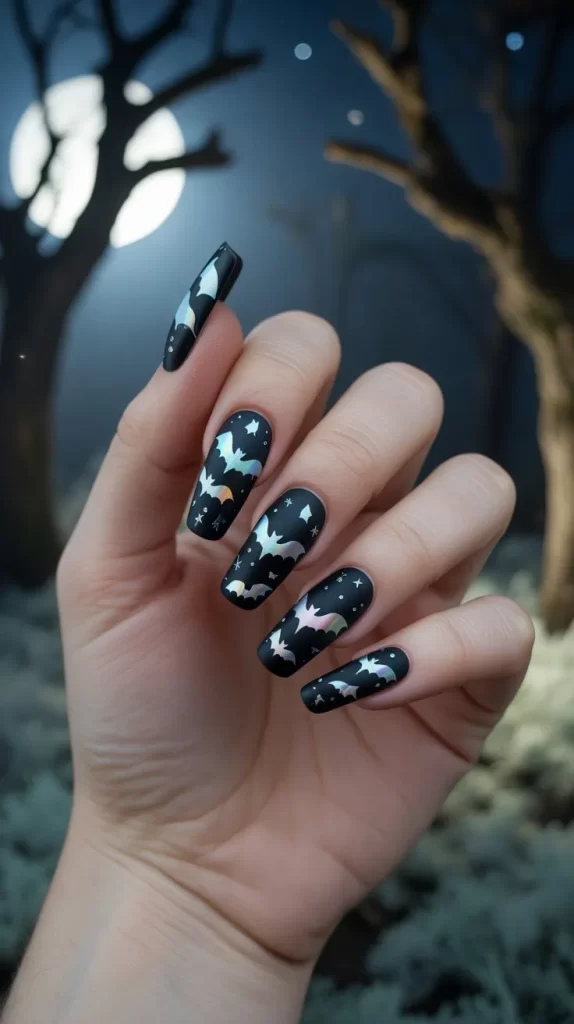 Holographic bats shimmer under light, giving your Halloween nails a 3D look. This design is spooky yet chic, perfect for anyone in the USA wanting both glamour and Halloween vibes in 2025.