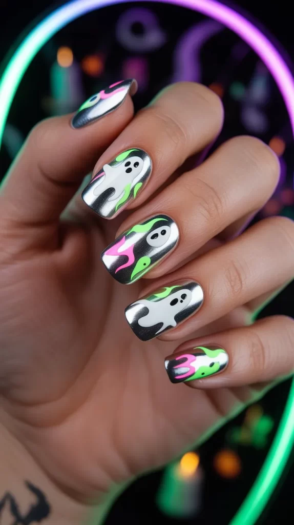 Metallic ghost nails are a haunting update for 2025. With chrome silver bases and glowing ghost overlays, this design blends futuristic shine with Halloween spookiness, making it perfect for USA partygoers looking for something unique.