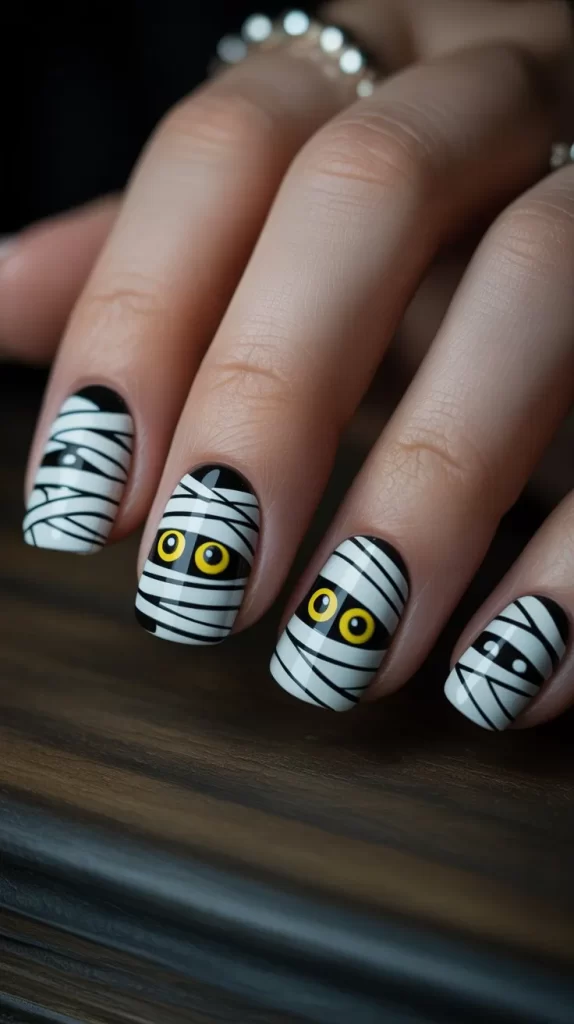 Mummy nails remain a fan favorite in 2025. Featuring bandage-like stripes and glowing eyes, they’re spooky yet cute, perfect for kids and adults at USA Halloween parties alike.