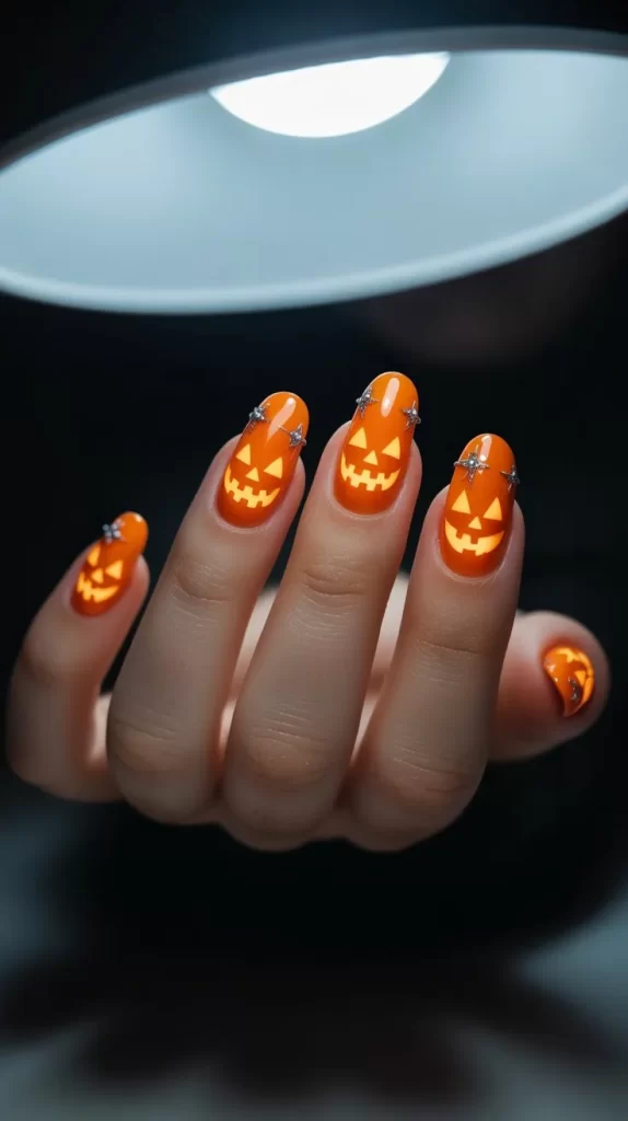 Jack-o’-lantern nails are timeless, and in 2025 they feature glowing orange pumpkins with carved faces. Perfect for fun, family-oriented Halloween activities across the USA.