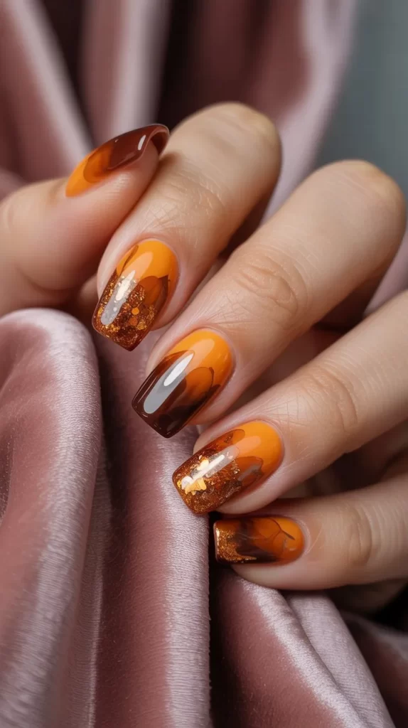 Pumpkin spice ombre nails capture fall warmth and Halloween festivity. With orange, copper, and brown gradients topped with subtle glitter, this cozy yet spooky style is trending across USA parties and seasonal gatherings in 2025.