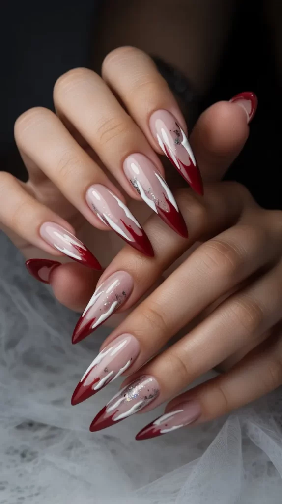 Bloody drip nails get an upgrade with chrome bases in 2025. This design mixes shine with gore, creating edgy vampire-inspired nails that are trending across USA clubs and haunted attractions this Halloween.