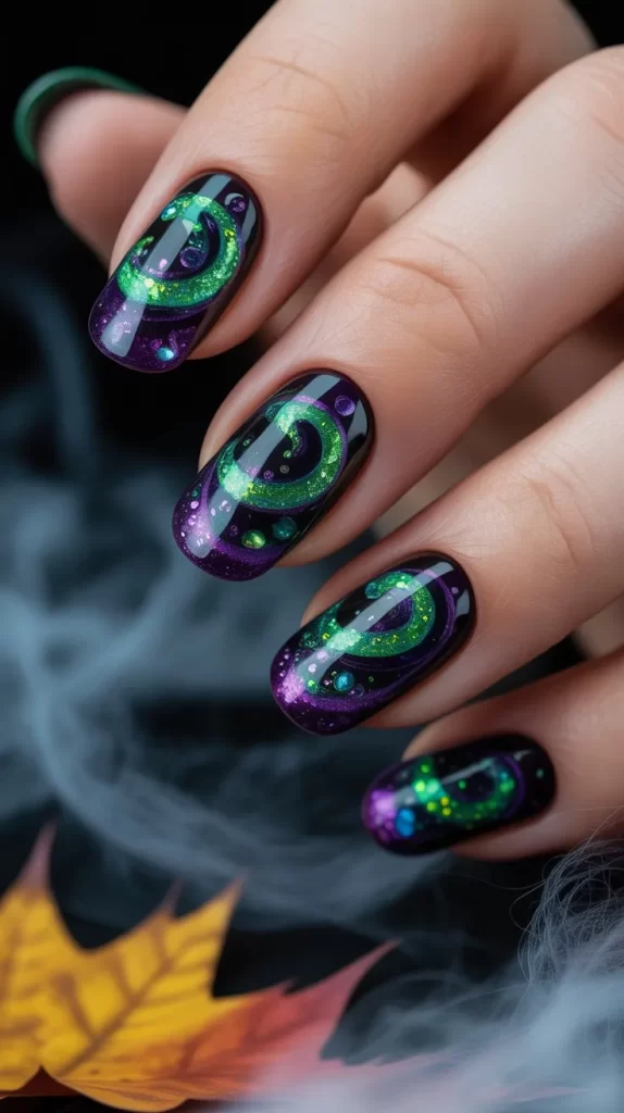Witch brew nails are magical and trendy for 2025. With swirling green, purple, and blue glitters, this design looks like a potion in motion, ideal for glamorous USA Halloween events.