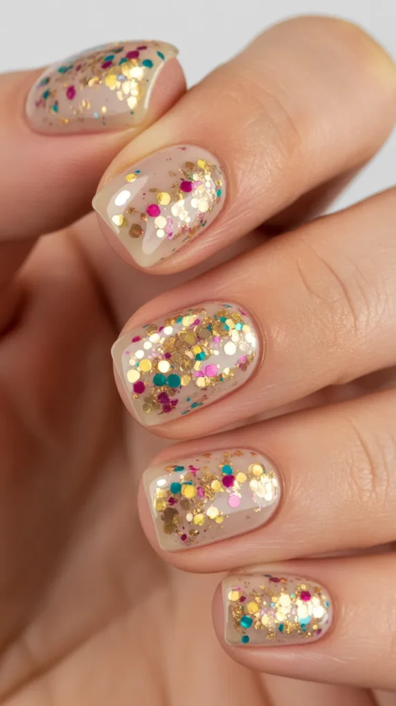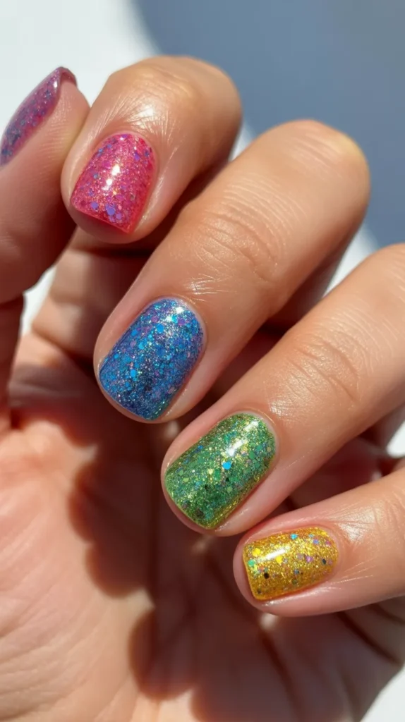 Buying a small multi-color glitter pack is a smart purchase because it gives you many design options. This style is bright and playful, making it perfect for Instagram and Pinterest content. It is also budget-friendly if you already own basic clear polish.