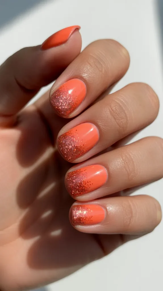 Coral glitter fade nails combine a bright coral base with matching glitter near the tips. This look feels warm and vacation-ready.